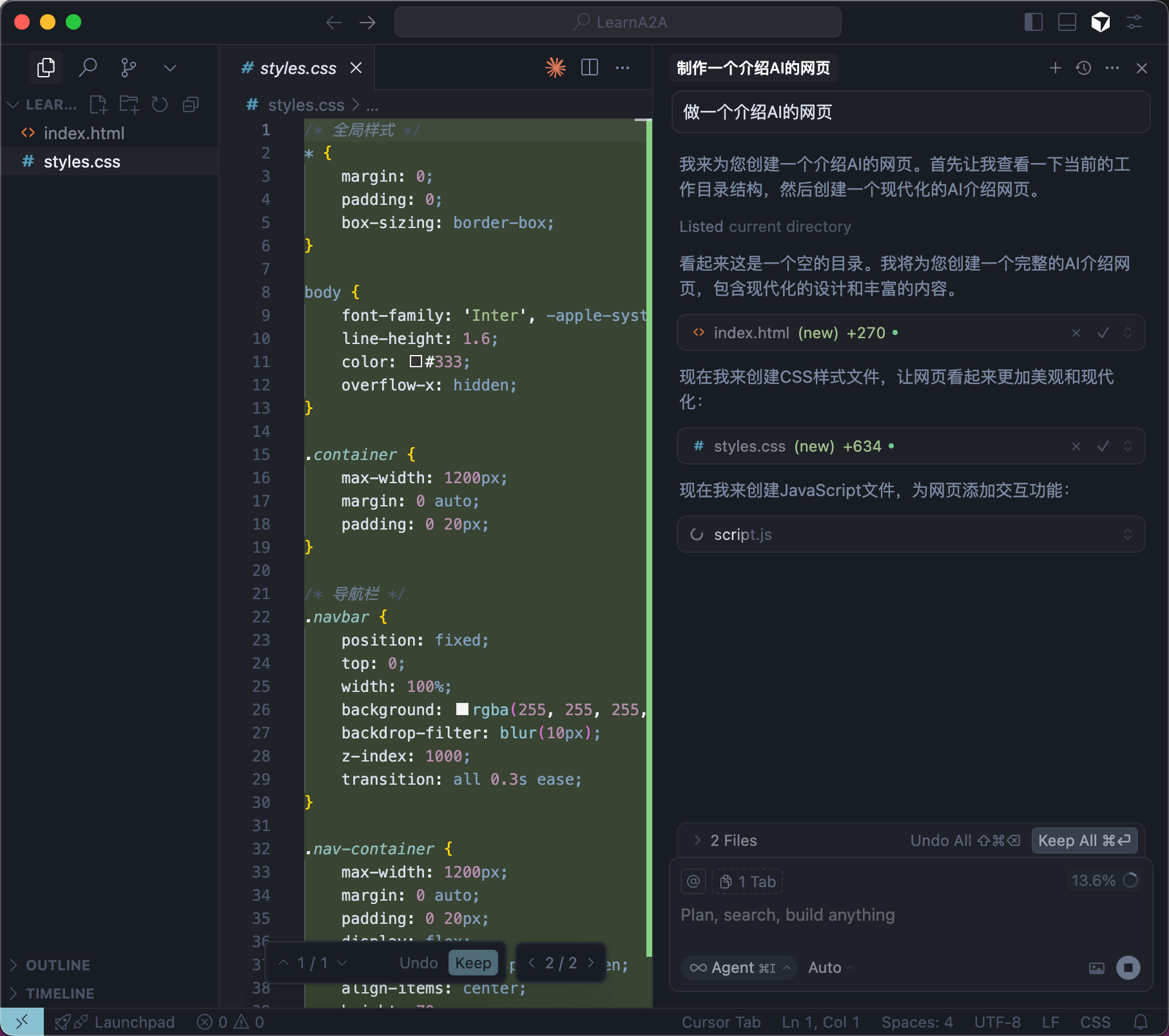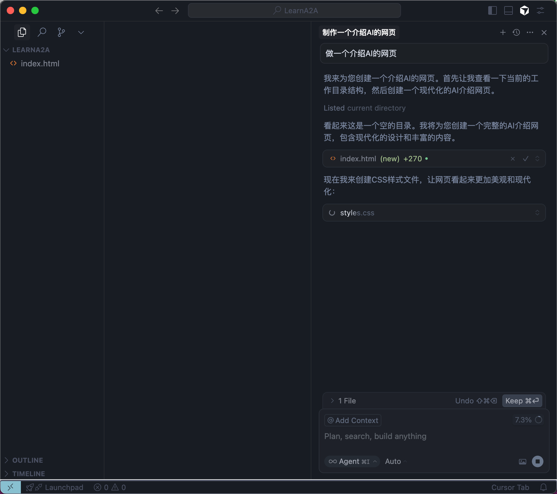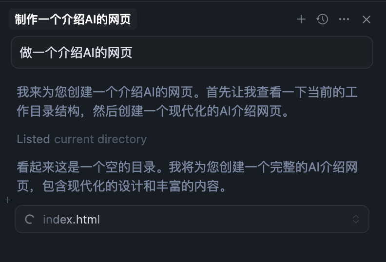 比如我们问 Cursor「做一个介绍AI的网页」。