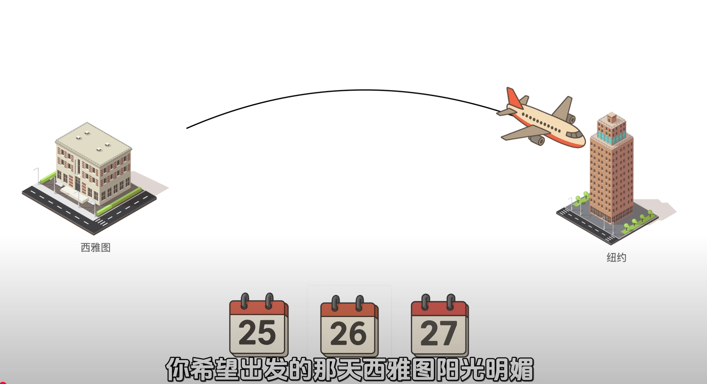你住在西雅图,希望在25-27号这三天里能出发去纽约。并且你希望出发的那天西雅图阳光明媚。