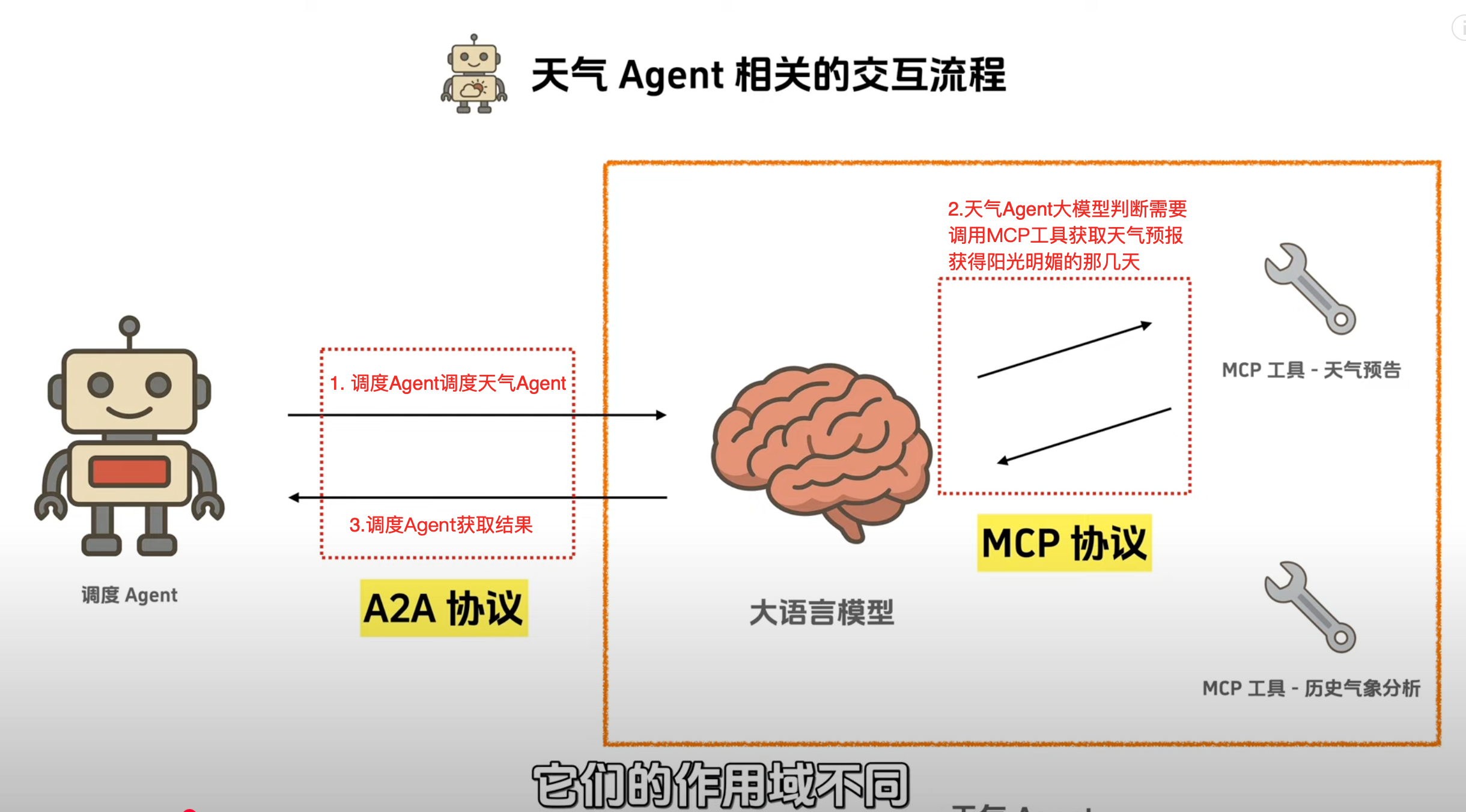 我们拿天气查询Agent来举例,A2A主要作用在Agent外部,MCP协议主要作用在Agent内部。这是两个协议的最大区别。