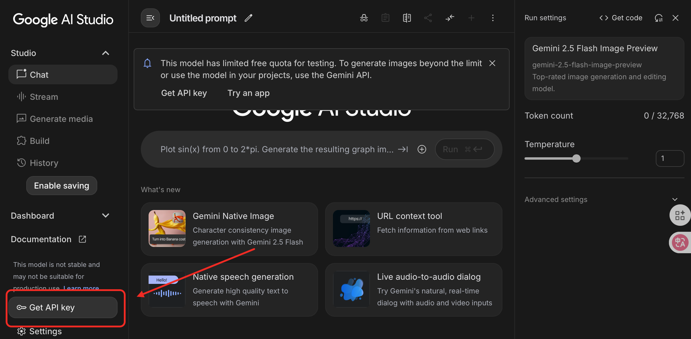 如果已经登录,应该直接会跳转到 https://aistudio.google.com/prompts/new_chat 这个路径。和视频中不同,获取按钮已经替换到了左下角(25年8月27日):