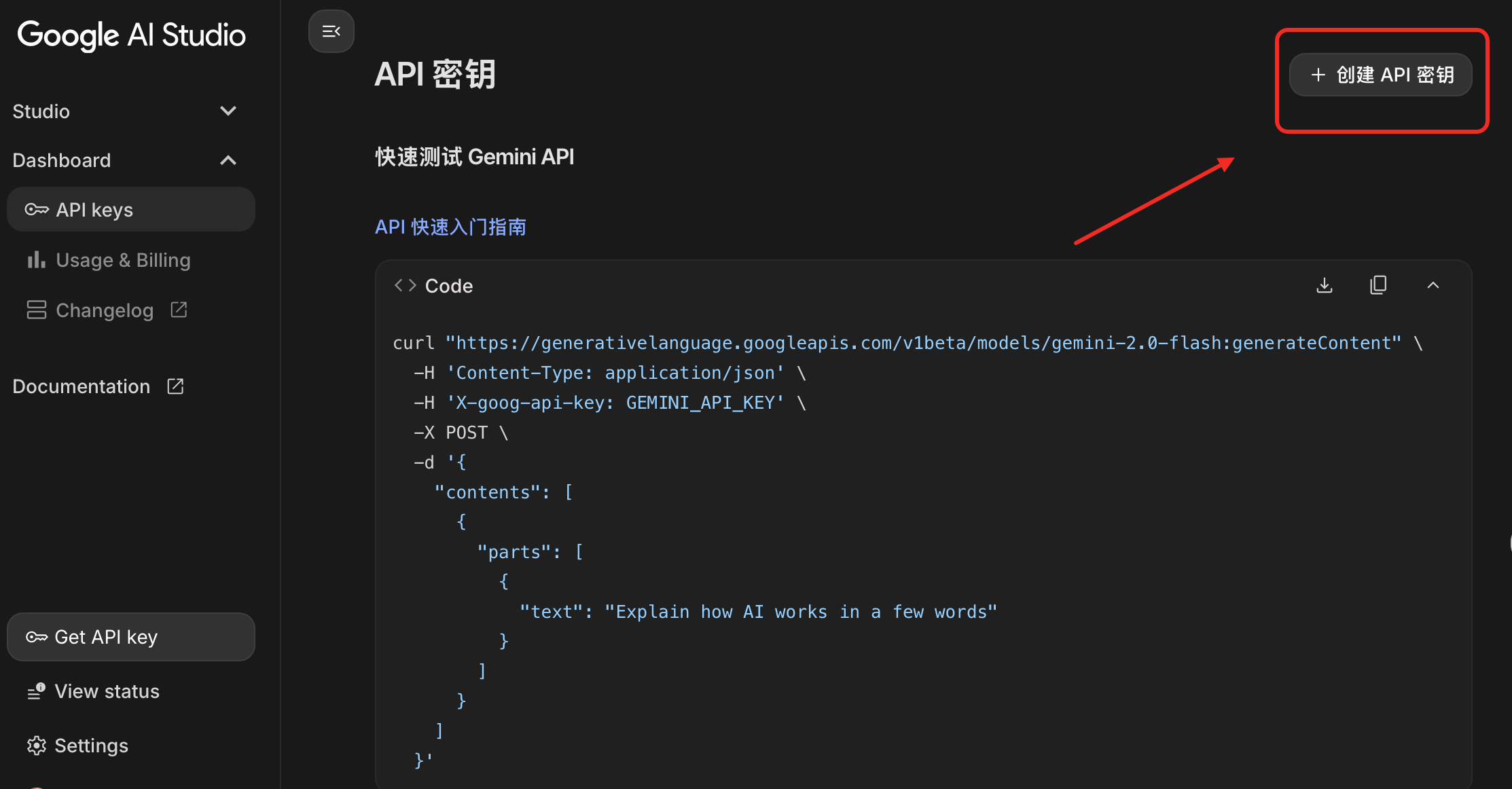 但是使用 Google 的 Agent之前, 你可能会遇到第1个问题。还需要先获取到 AI-Studio 的 API 才可以玩起来。 请点击Google AI Studio,获取API Key。