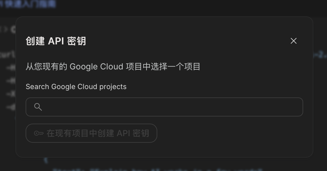 如果你没有创建过任何API Key,则直接可以选择下图置灰的「在现有的项目中创建API密钥」,直接能到创建成功。反之,你可能会因为已有项目遇到第2个问题,需要新建一个 Google Cloud 项目: