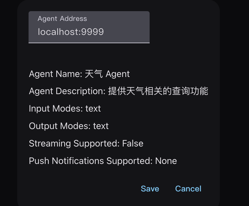 每关联一个Agent之后,调度Agent都会收到一张Agent Card,让调度Agent知道,这个Agent 能做什么,以便后续在合适的时候选择Agent来办事。